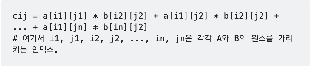 - 행렬 C의 각 원소 cij는 다음과 같이 계산된다.
