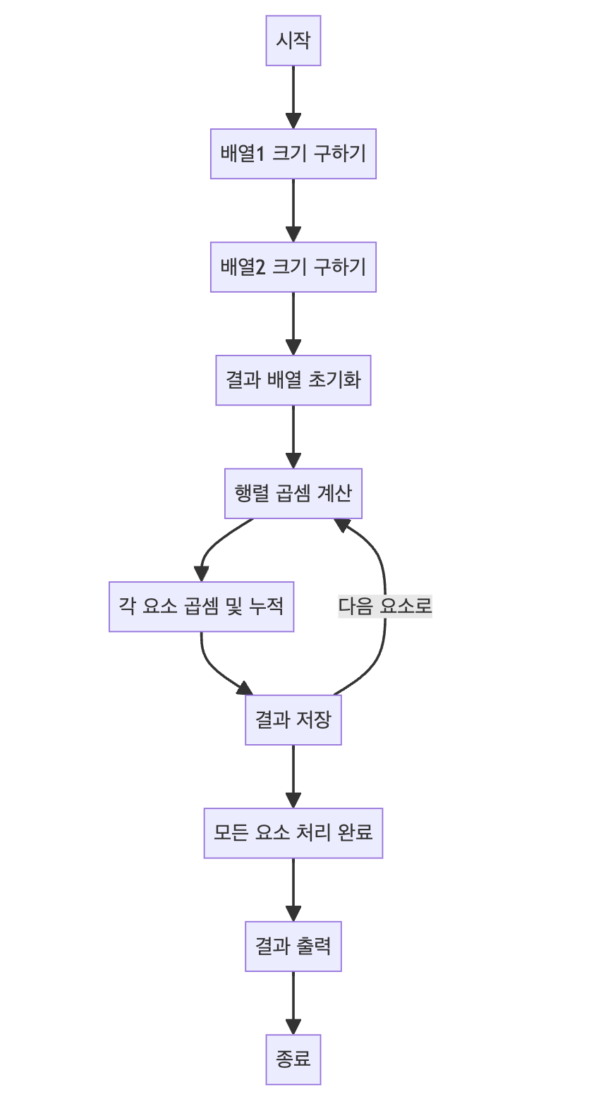 - 코드에서는 이러한 원리를 기반으로 중첩된 반복문을 사용하여 각 원소를 계산하고 결과 배열 C에 저장. 각 원소 cij는 A의 행 i1과 B의 열 j2를 곱한 값들을 모두 더한 값이 된다.