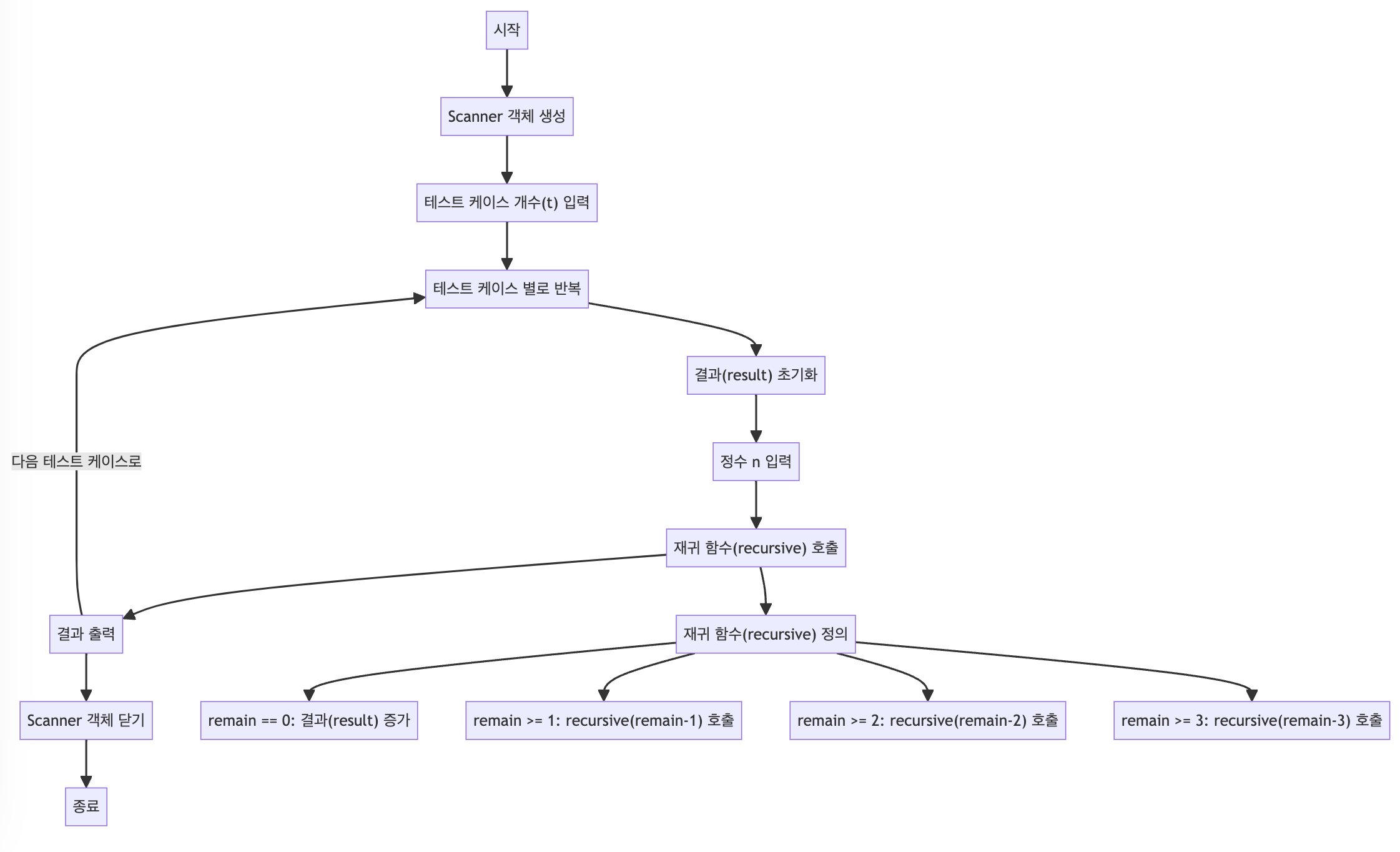 - 재귀 호출은 1, 2, 3을 각각 n에서 빼는 것을 반복하며, 각 단계에서 가능한 모든 경우의 수를 탐색.