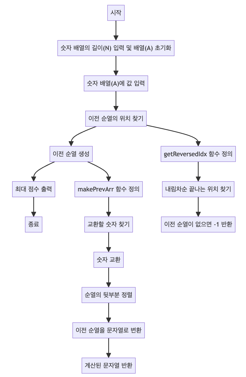 - 주어진 순열에서 바로 이전 순열로 변경할 위치를 찾은 후, 해당 위치와 교환할 숫자를 찾아 순열을 변경