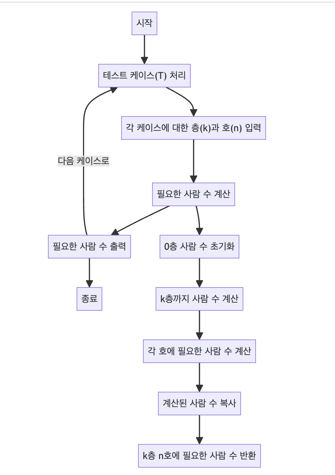 - 주어진 층(k)과 호(n)에 살아야 하는 사람 수를 계산하는 문제를 해결.
