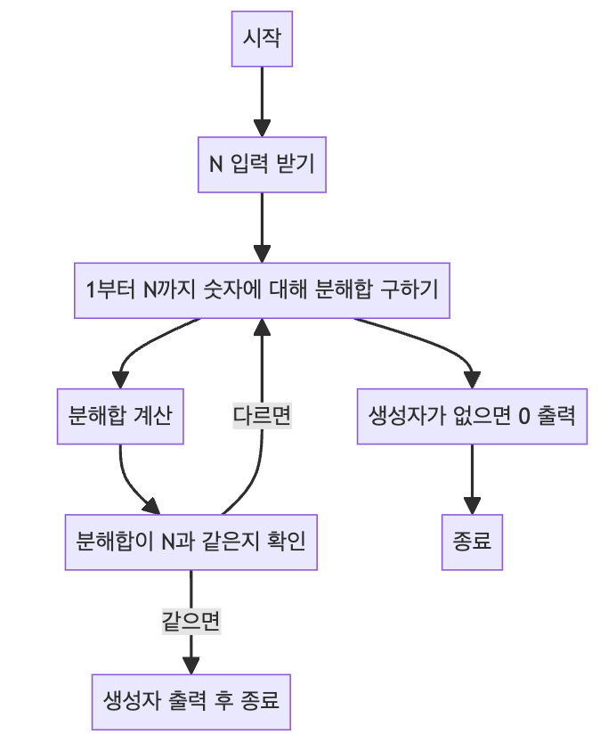 - 주어진 N 값에 대하여 1부터 N까지 모든 숫자의 분해합을 구하며, 해당 분해합이 N과 같은 경우 해당 숫자를 출력