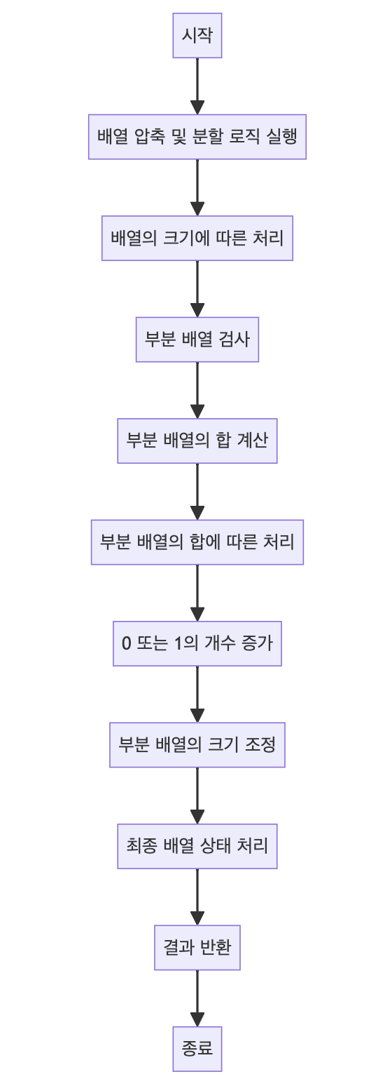 - 이 과정에서 0과 1의 개수를 세어 answer 배열에 저장하고 반환